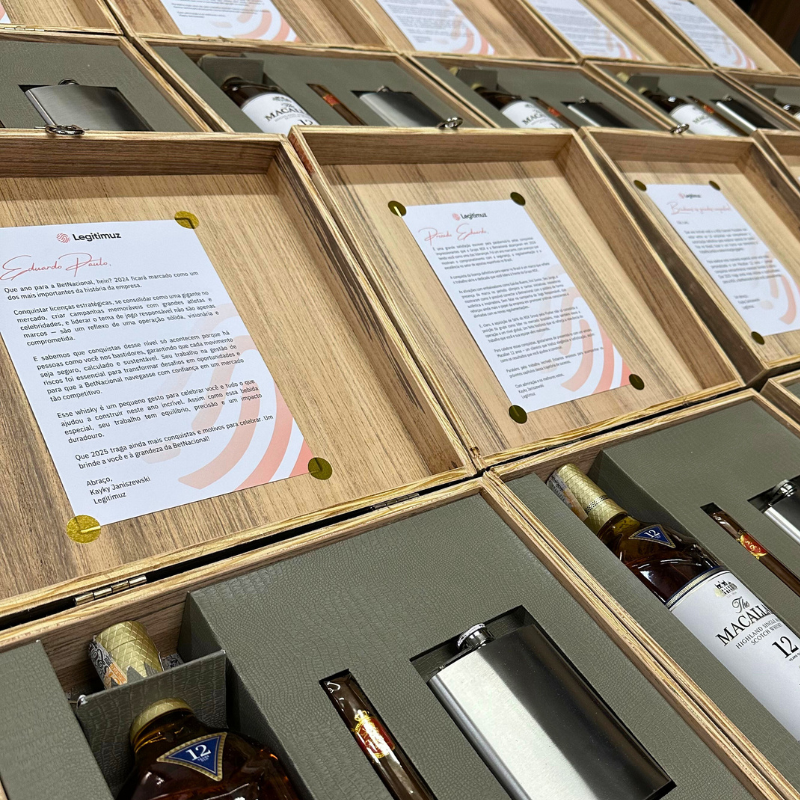 Fomos convidados pela Legitimuz, para desenvolver um presente único e memorável: um kit de whisky personalizado, criado especialmente para homenagear os diretores da Bet Nacional, em comemoração ao sucesso da marca no mercado brasileiro.