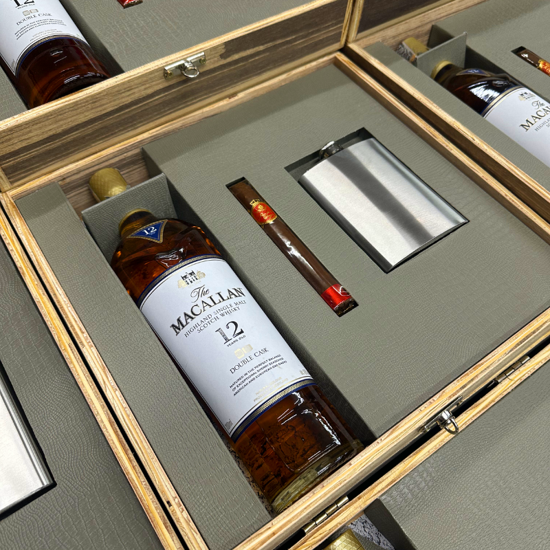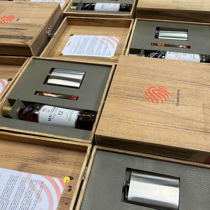 Nosso time de criação desenvolveu um kit de whisky personalizado com exclusividade em caixa de madeira MDF, com acabamento premium e seleção refinada de itens.